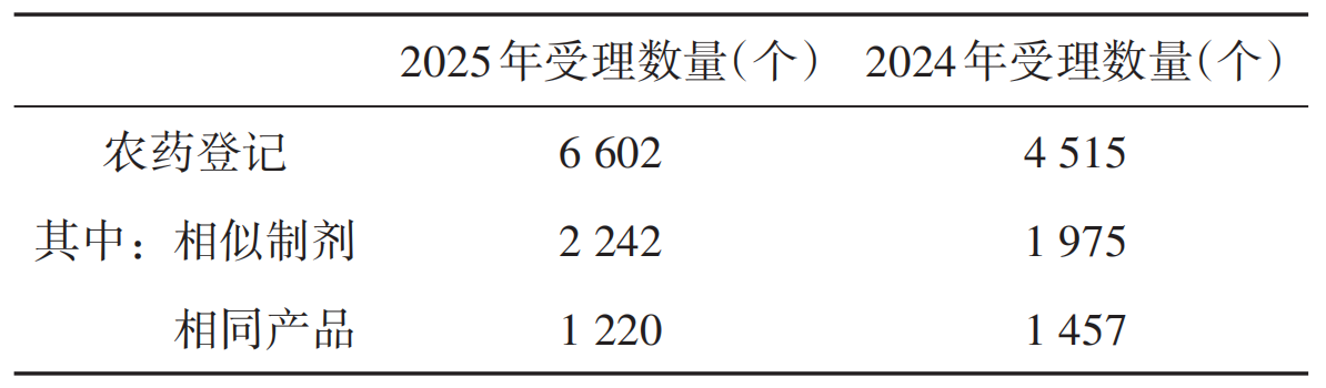 1.1 受理数量 2025年农业农村部政务服务大厅共受理农药登记(不含仅限出口农药登记,下同)6 602个,较2024年增加了2 087个,增长46.2%。其中,相同产品和相似制剂农药登记(指申请人在填报时勾选的相同产品或相似制剂)3 432个,占农药登记受理总量的52%(表1)。